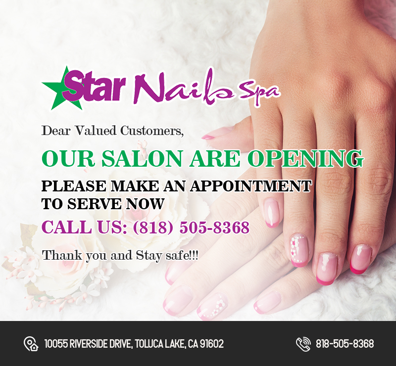 Visiting Star Nails Spa - nail salon 91602 is not just your average manicure or pedicure, it is your 1-hour retreat from the stress of everyday life. Your mini-vacation is complete with pampering by a courteous and knowledgeable staff, as well as with the peace of mind of knowing that your treatment is hygienic and safe for you and the environment.